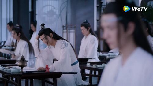 第4話「異端の仙師」感想 原作小説「魔道祖師」第13章、第14章。 姑蘇藍氏家規と座学 藍氏家規【誅妖邪 立正法 大道永存/邪法を除き、正法をたてる】が映し出される。鐘の音と共に、筆写の罰で家規に埋もれていた魏無羨が起きあがる。