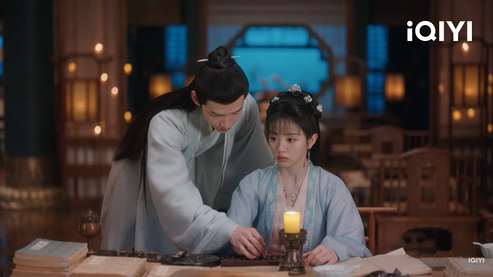 そろばんの練習に不慣れの李薇を、背中越しに手を取って教える恒例のドキドキタイム。挿入歌『南風』が流れる。
